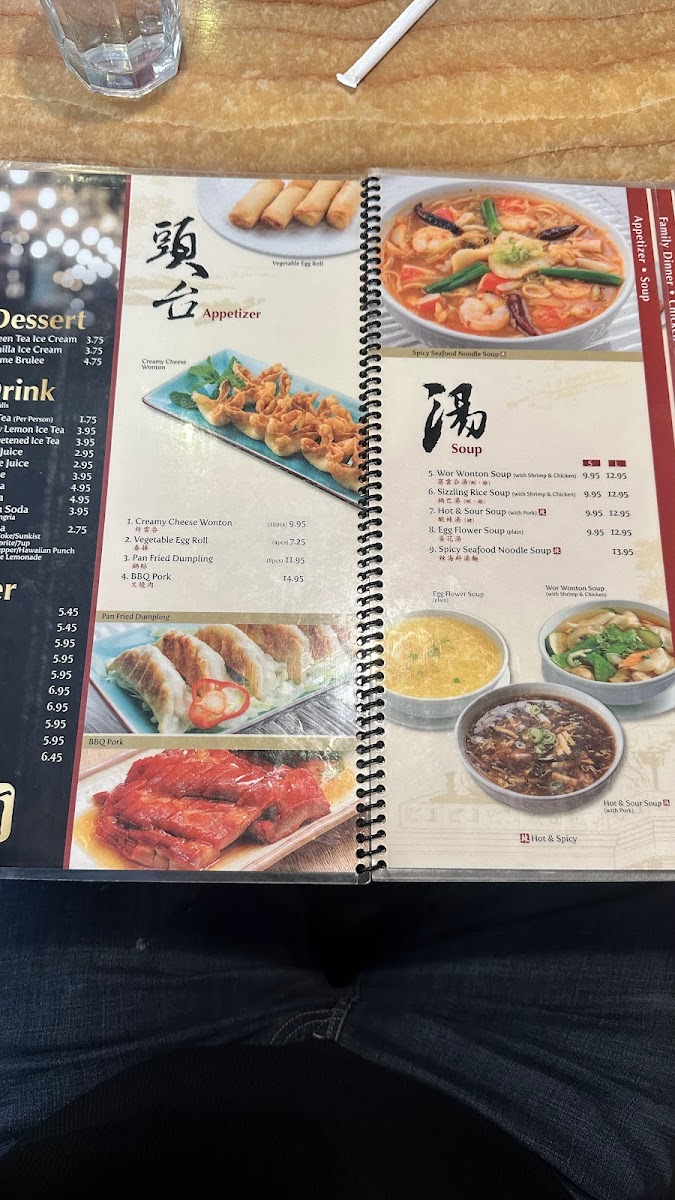 Soups feature traditional choices like Wor Wonton Soup with shrimp and chicken, Sizzling Rice Soup, Hot & Sour Soup with pork, Egg Flower Soup, and Spicy Seafood Noodle Soup, catering to varied preferences.